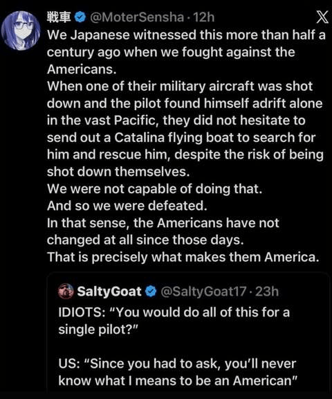 So when you see people mouthing off online about how we lost equipment and questioning why we would go in and get one pilot out? Understand that those who ask these questions are not Americans. Answer them as such.