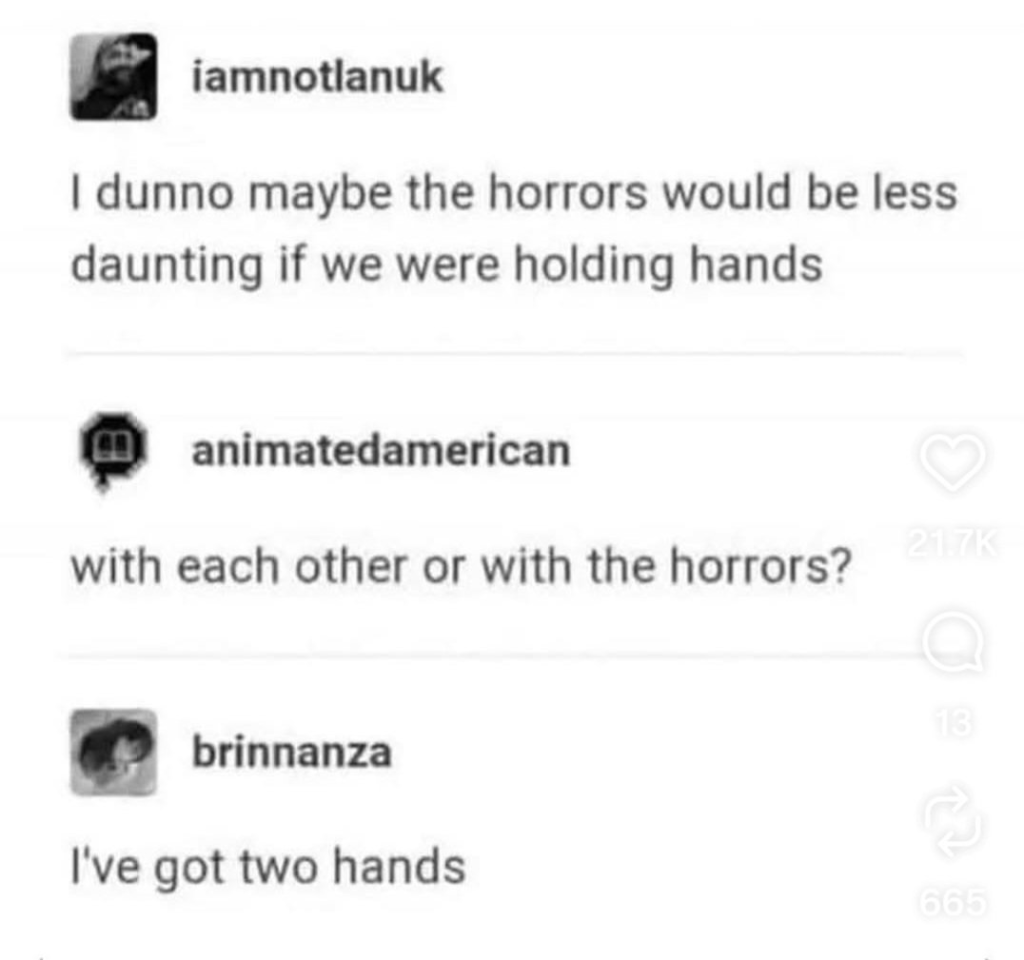 Instead, every time I try to say this I’m met with screaming, fits, tantrums and destructive rages and assurances that no, we’re more broken than ever and the only solution is to burn it all down.