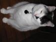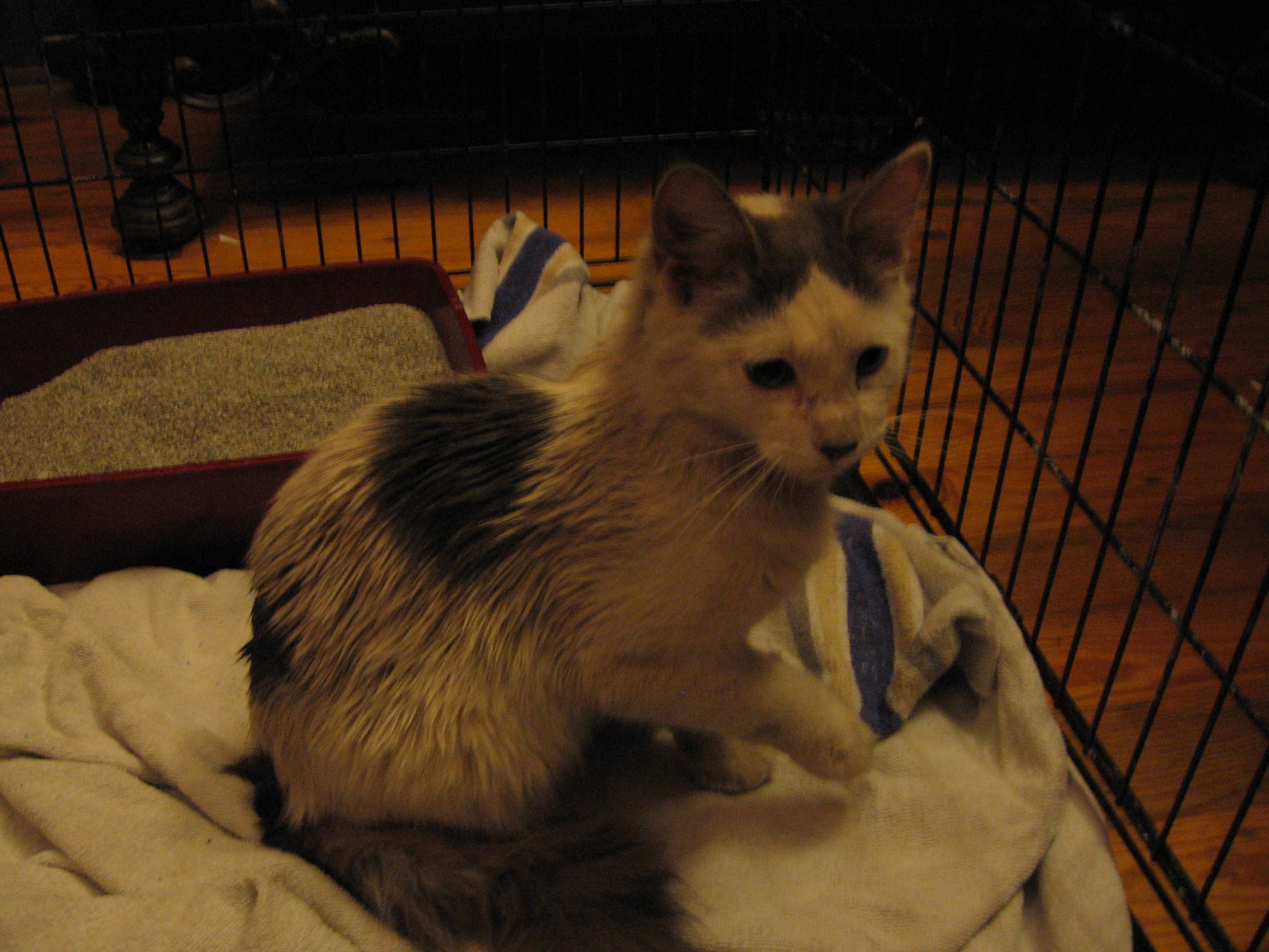 This is Havelock Vetinari Hoyt when we got him. As you can tell he was a sorry sight. He was living on our favorite mini golf course (yes, we play mini golf. We’re very thirties-retro) as far as we can tell living from bugs and feature water. He was also getting chased and hit with clubs because he messed people’s plays and some teen males (not mine) are dangerous idiots. I do a lot of cat rescue. we couldn’t resist. Besides, since he seems to be a Turkish Angora we thought some family MUST be looking for him.