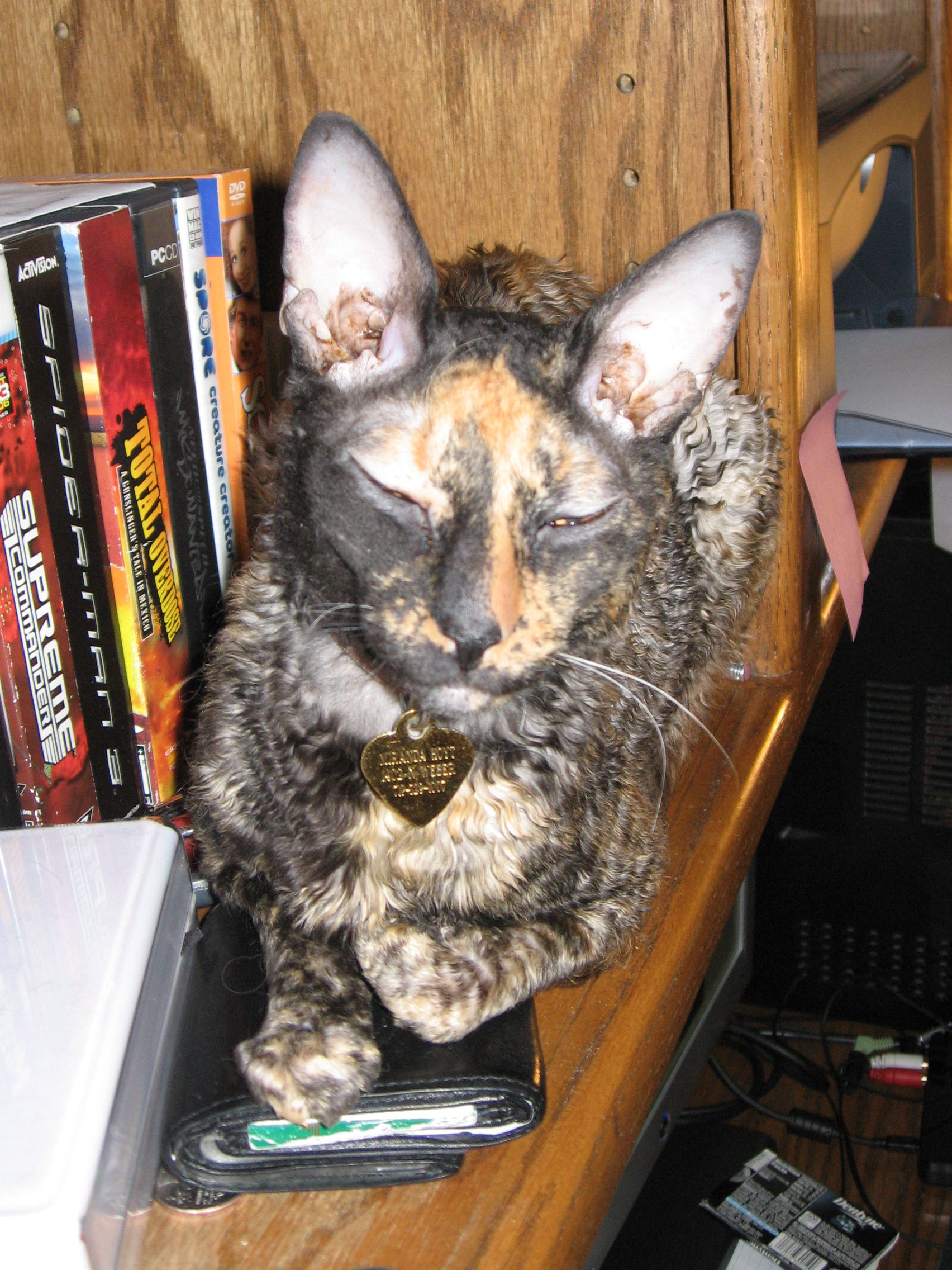 Here you see her holding is wallet and wondering if he REALLY needs another video game. She’s a Cornish Rex and the only cat we ever paid money for. She’s a little smarter than the others and rules us all.