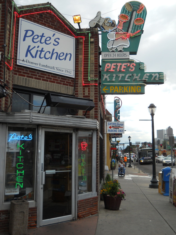 You’d probably like Pete’s Kitchen. Honestly, it’s much reformed now, though if you go in at three am (I can’t for the life of me now remember WHAT in heck Robert and I went up for at that unholy hour. Had to do with some friend, of course, since nothing is open at that time? Or maybe it was a soire at a museum. It was… three? years ago? Anyway, we went by there of course, because DUH you go to Denver, you get Pete’s, even if you grab takeout and then put it in fridge for breakfast when you get home) you’ll still find the local… er… trade. (Prostitutes, at least, drug deals sometimes in parking lot, both okay if you just walk past and ignore.) BUT when we started going there, when Robert was little, the booths were old cracked linoleum, and the walls were grease-stained. Food was great, though, and since policemen ate free there, it was safe, even in the middle of a skivvy zone. So — we kept going there. Now the area is rather gentrified but still colorful, they have new booths, the place has been repainted. I’m not sure how I feel about the marble tiled bathroom, which is the latest innovation and seems rather out of place, but I suppose it’s easier to hose down. Food is still good.