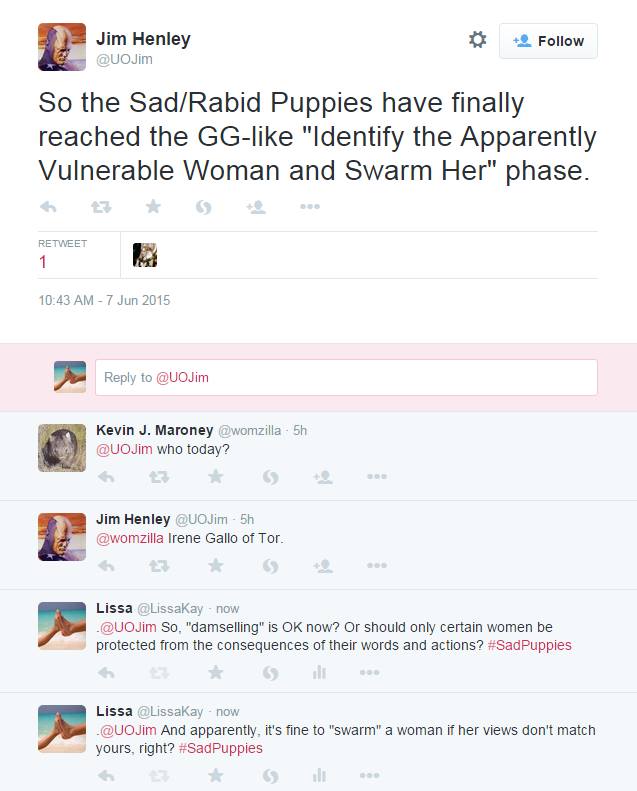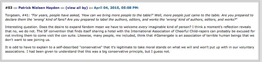 They’re trying to help us, honestly. Why aren’t we grateful? (eh. “You should be thanking me.”) They want more minorities and poor people in science fiction, because that’s the decent thing to do. And of course they don’t want minorities and poor people who don’t agree with them, because, as Marxism explains they’ve been colonized by the oppressive culture. And why would you want to propagate the oppressive culture.