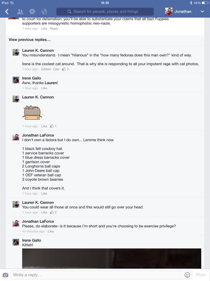 Note also that when one of my fans jumped in and tried to correct the misconceptions, she responded with daft cat pictures.