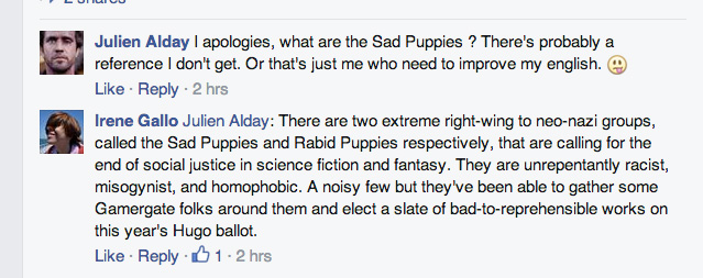 This feebleness of mind was in stunning display recently in the Facebook page of one Irene Gallo, Creative Director at TOR. (I hope that’s an art-related thing. Or do they think authors need help being creative?)