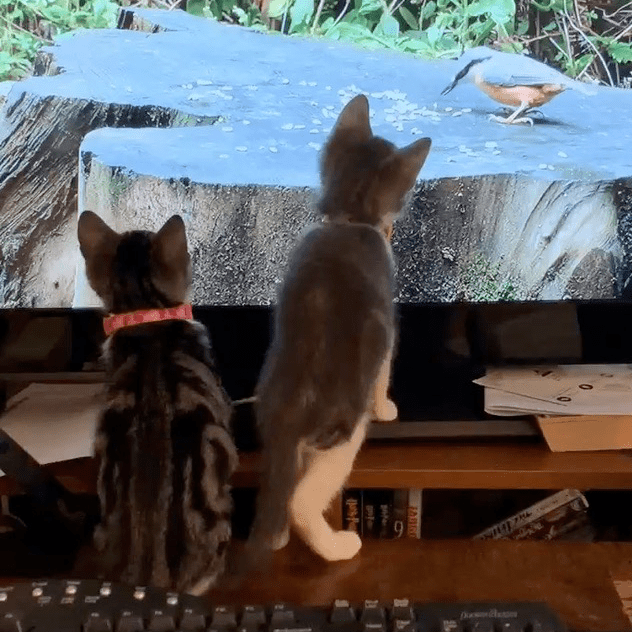 At about 6:30 am, through my eyepiece I saw the two little fuzz balls exit the house via a secret tunnel behind the couch. They looked incredibly unhappy! Hissing, hair standing on end, eyes searching for anything to tear apart. I gripped the shark cage for reassurance. I was not reassured. Day after day I saw the same pattern. The risks were high, but I was patient. Why in the world were they starting their day so upset? That’s when the trash can blew over.