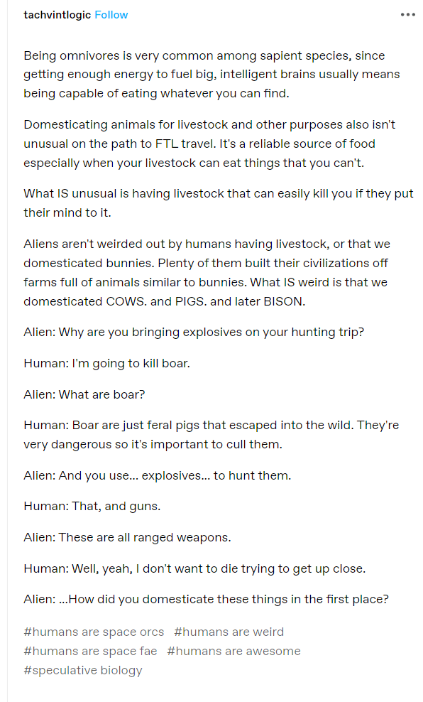 That’s what I was thinking. Dude, never mind the rest; humans have domesticated PREDATOR species — we’ve got finely tuned little killers (cats) and deadly pack hunters (doggos) just lounging around our houses and even doing our bidding, and we act like it’s no big deal.