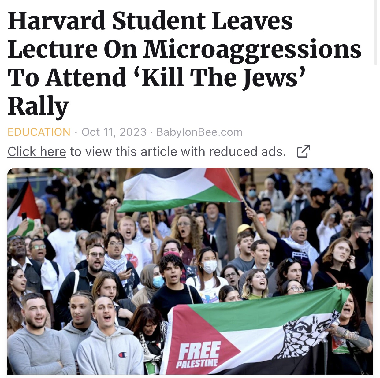 Perfect summary from the Babylon Bee of the pure evil on college campuses: