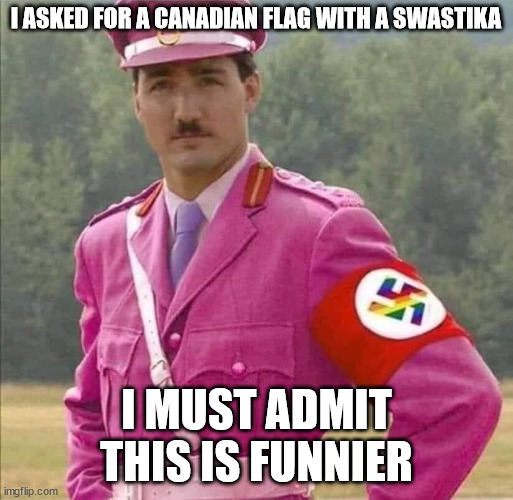 Trying to find Canadian flag with swastika replacing maple leaf, all I can find is this, which in all truth is funnier. https://i.imgflip.com/8in6gx.jpg