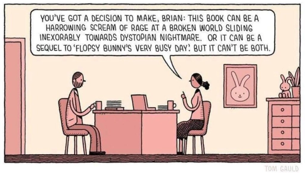 Oh, I have no doubt that you could write a sequel to “Flopsy Bunny’s Very Busy Day” that would be “a harrowing scream of rage at a broken world.” What would be almost impossible would be to write such a sequel that wouldn’t cause the reader to throw the book at the wall at Mach 1, not even caring that they were reading on their Kindle, go on the internet and leave reviews about how you’re an evil person who misled them about the contents of the book, and then blacklist you as a writer for the rest of this life and possibly future lives as well.