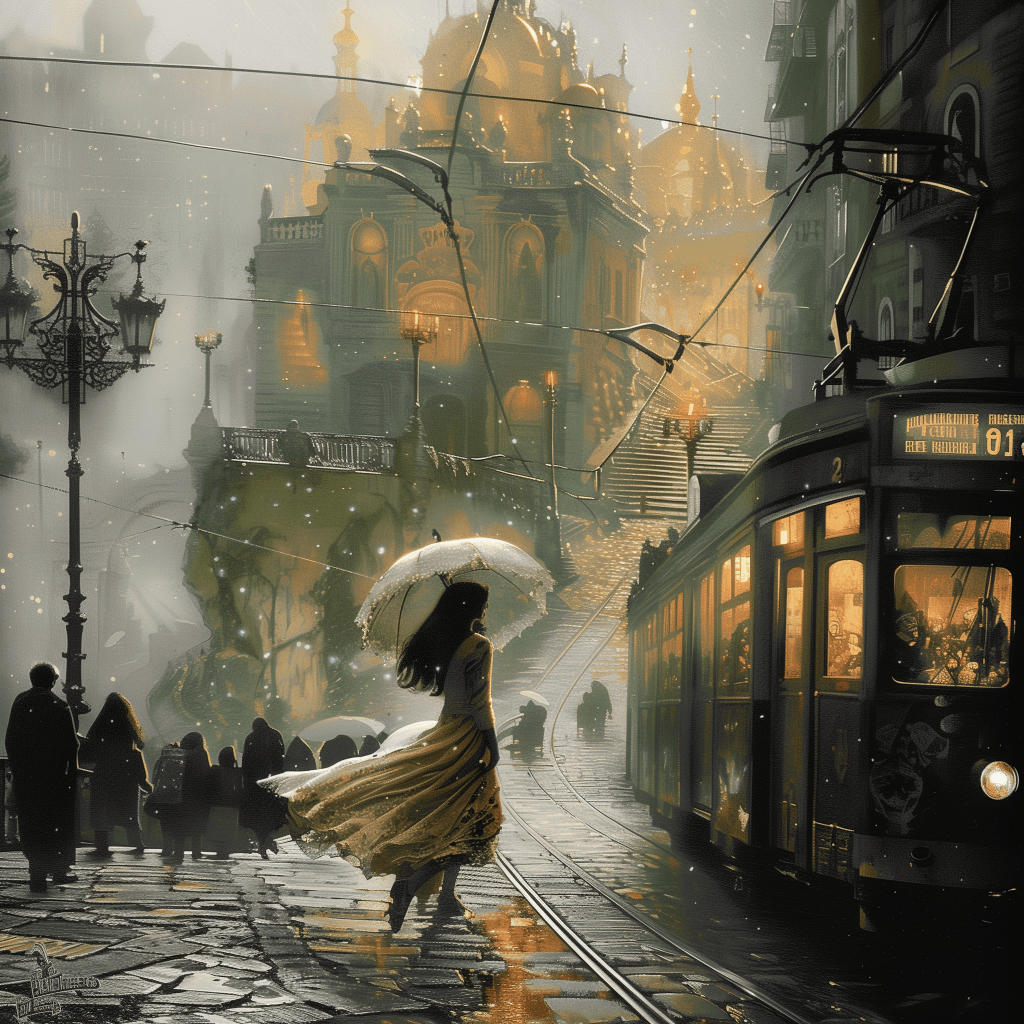 Hmmm…MidJourney seems to have trouble putting streetcars on their tracks. They all look to have left wheels on the right-side track and right wheels on the cobbles. Can’t see any tracks in the last image, and why is there a wire hanging below shoulder level?