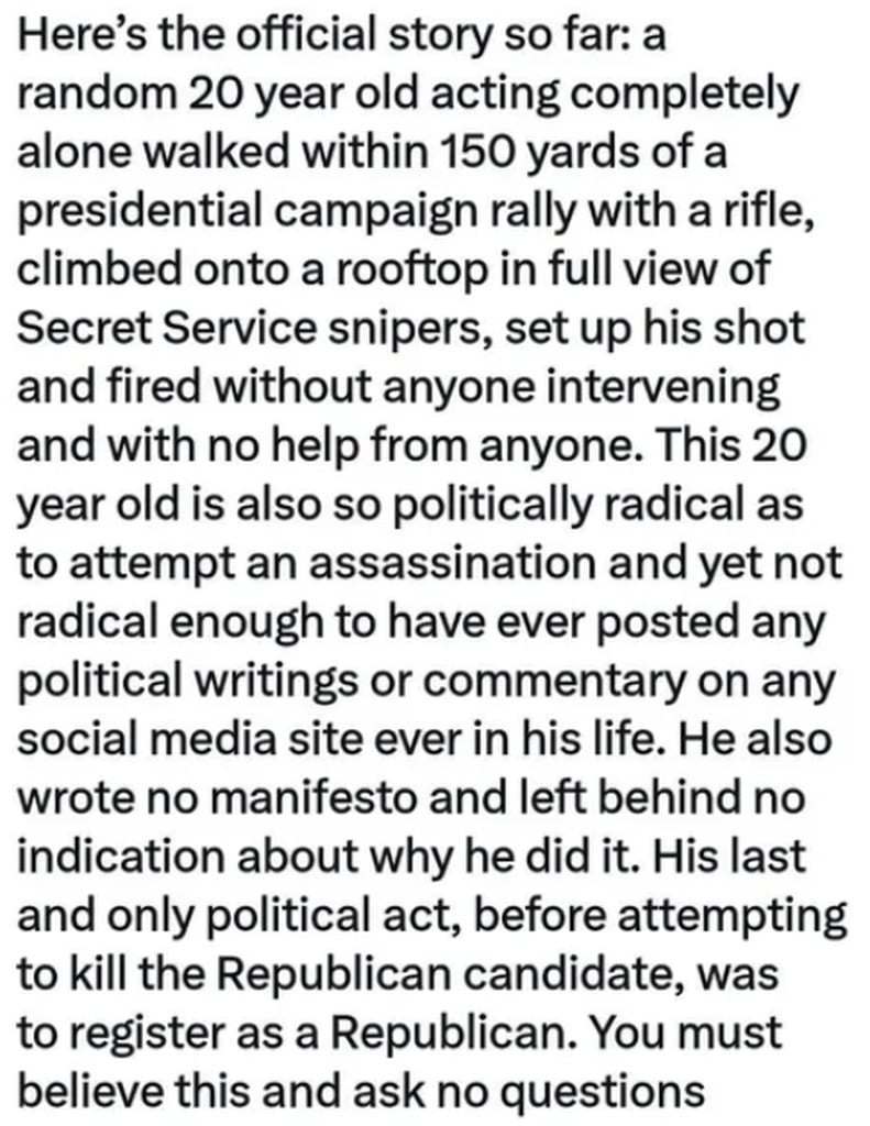 Tomorrow morning is (obviously enough) Monday. The day some of the counter-assassination security screwups start to come (even more) under close scrutiny. And 9-ish days since the shooting, itself.
