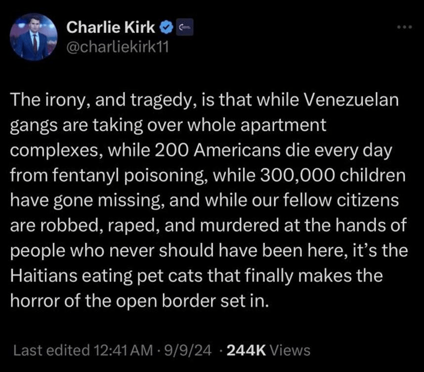 re: Springfield, OH. I don’t blame the Haitian immigrants that much, they come from a place where nobody has pets and any animals around are fair game for food.