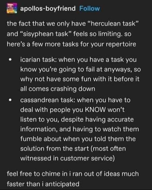 Orphiusyian task – you will do the impossible, you will preform so well the gods will be moved to tears, you will screw up right at the end and have the whole thing fall apart.