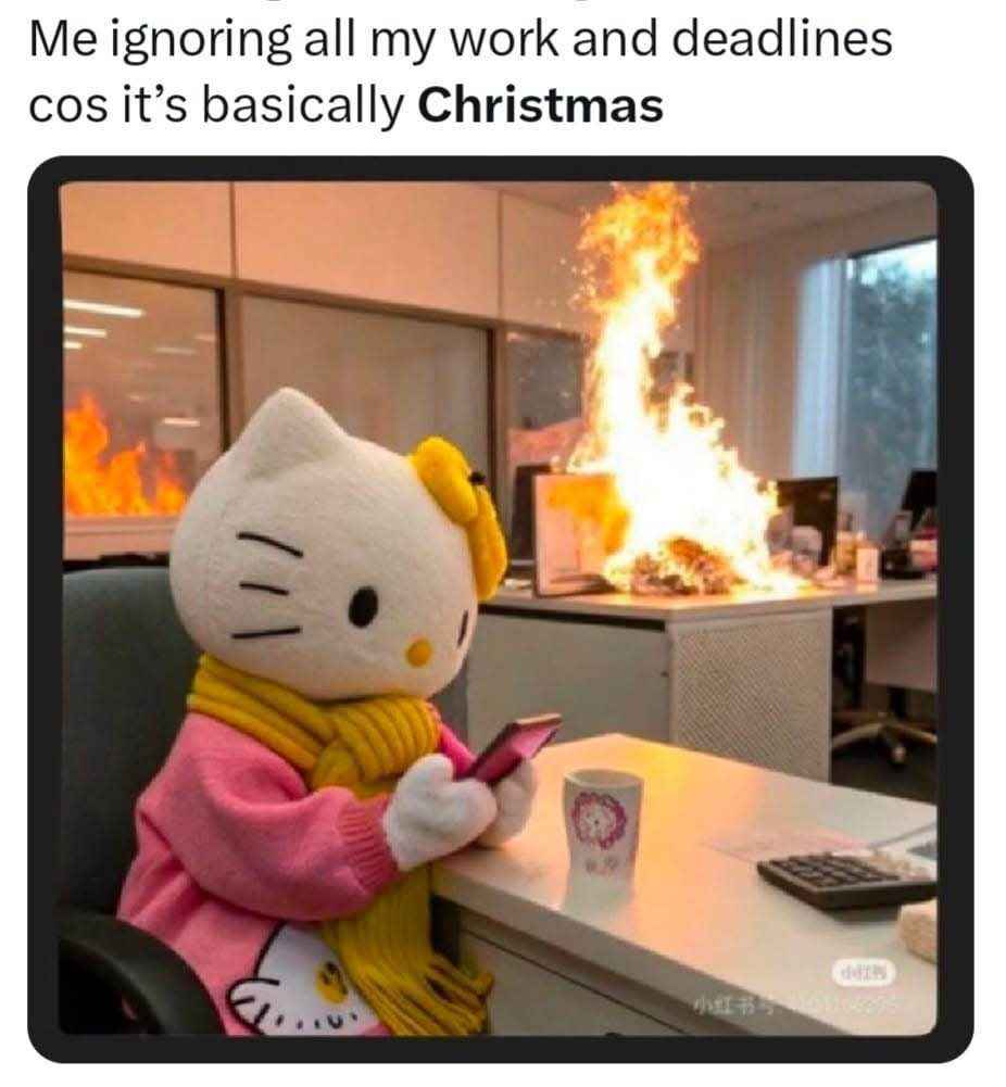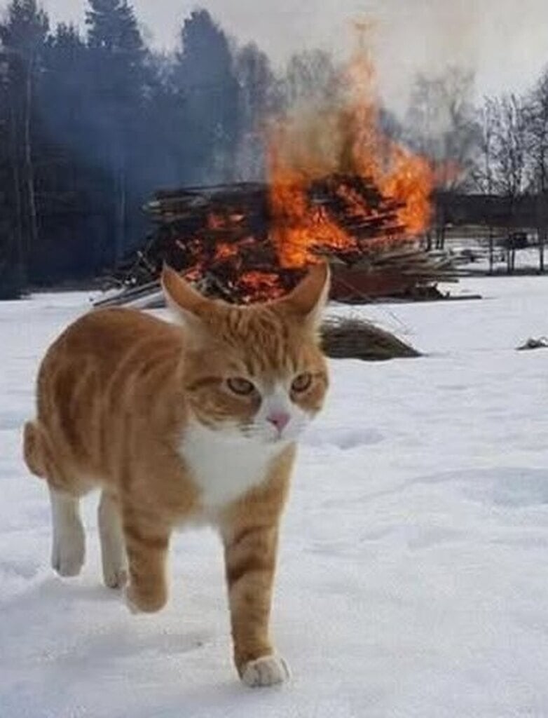 The one with the cat walking away from the burning structure should be labeled “My work here is done.”