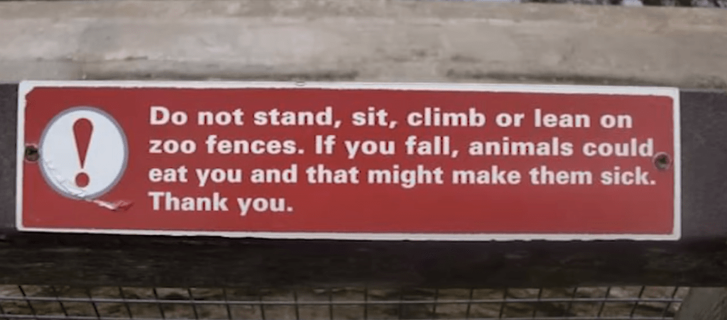 It does not seem to be on line anywhere, but I have a picture of a warning sign at the London Zoo showing a cartoon of a big piece of meat with legs.
