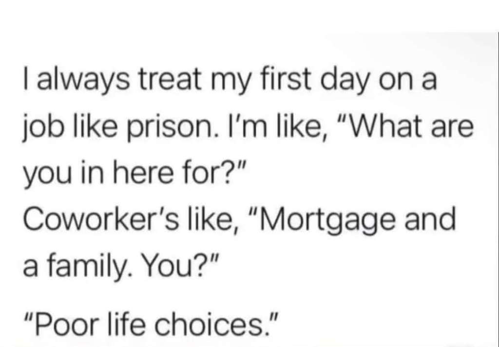 The “First Day on the Job” mime. Once at work a newbie asked how long I had been there. “Twenty-seven years, not counting the Federal time”.