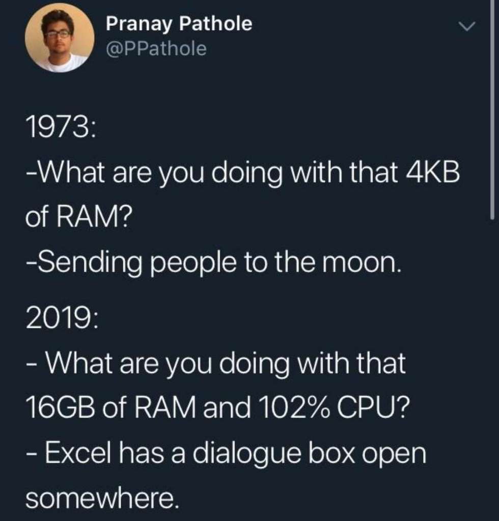 On that ’16 GB RAM and 102% CPU’ meme — it’s more like “Firefox has a pop-up window open running Flash”