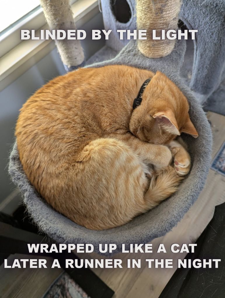 Yes. It’s Indy sleeping in his little basket on the cat tree, next to Dan, covering his eyes against the light.