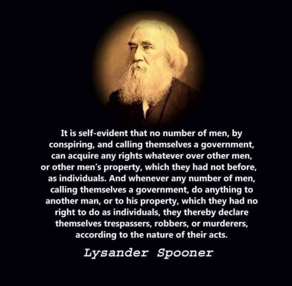 The Spooner quote reminds me that I found a bunch of his writings on gutenberg.org (after having learned his name from L. Neil Smith). “An essay on the trial by jury” is fascinating. Jury nullification? Sure, but he uses history to go much beyond that.
