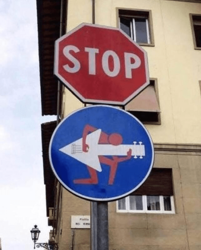 I read the sign beneath the stop sign as “Hey, what’s that sound? Everybody look what’s going down.”