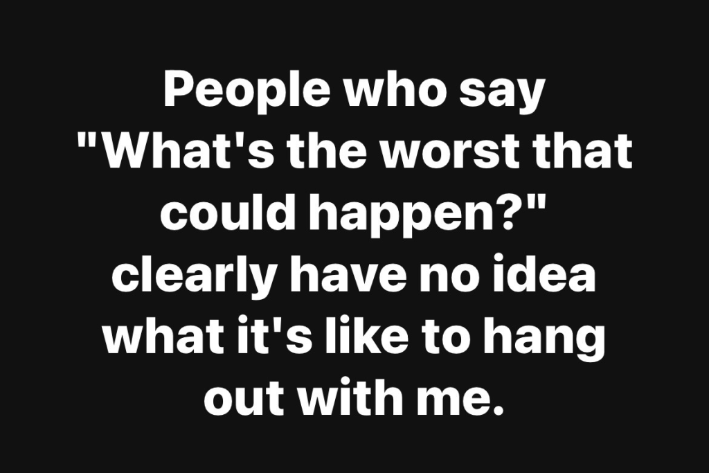 “What’s the worst that could happen?” NEVER say this around me! Things catch on fire! Motorcycles come out of nowhere! Nuclear plants melt down!