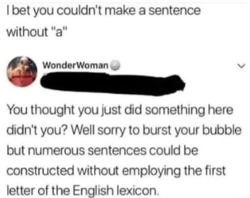 The bit about a sentence without “a” reminds me that someone once wrote a poem, or a short story, without the letter “e”. Now that is hard.