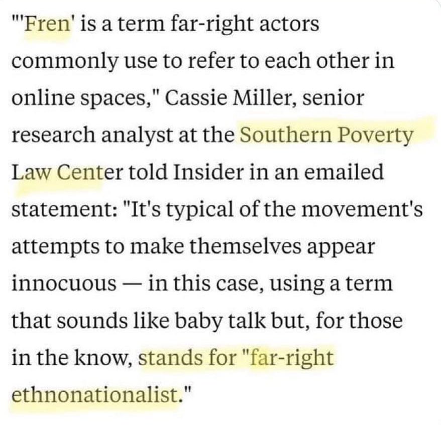 “Fren” gets used on Gab and 4chan and in Pepe memes a lot, so in that respect, it’s kind of a right-wing thing. Know why? Because the Gen-Z and Gen-A Right LOVE to meme. They grew up on lolcat cheezburgur memes. It’s how they communicate. Whereas the Left, regardless of age, is so busy being humorless scolds and figuring out pronouns that they don’t take time to have some fun with the language.