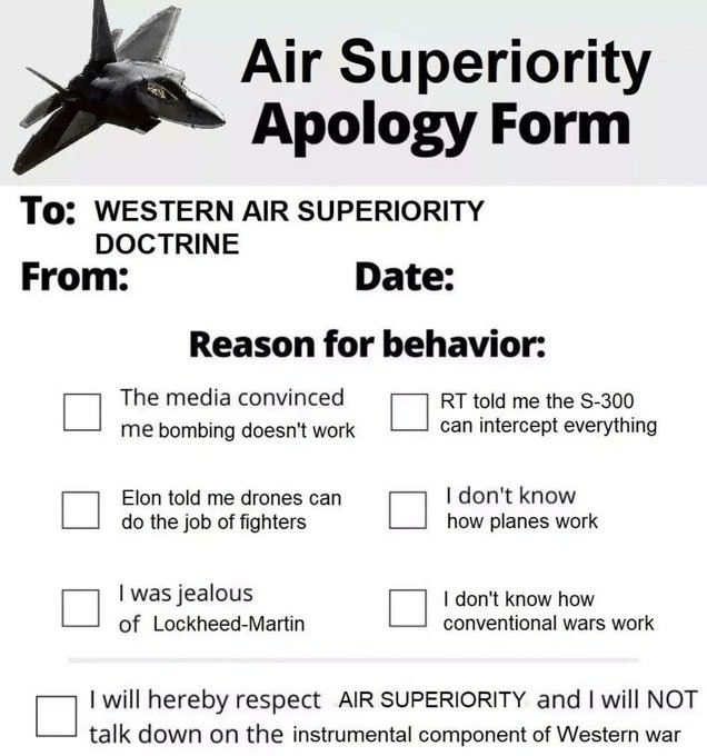 Re the “Air Superiority Apology Form”: I’m pretty sure the zillionaire Anduril guy with the mullet, aloha shirts, and beardlet is the one pitching drones for everything. (search…search…search) There he is, Palmer Lucky. Notably his solutions are way cheaper than LockMartBoeGenDynCorp’s stuff, so quantity as a quality all its own is much more within reach. But even from him I have not heard “quadcopters from Aliexpress will kill all the F-22s”.