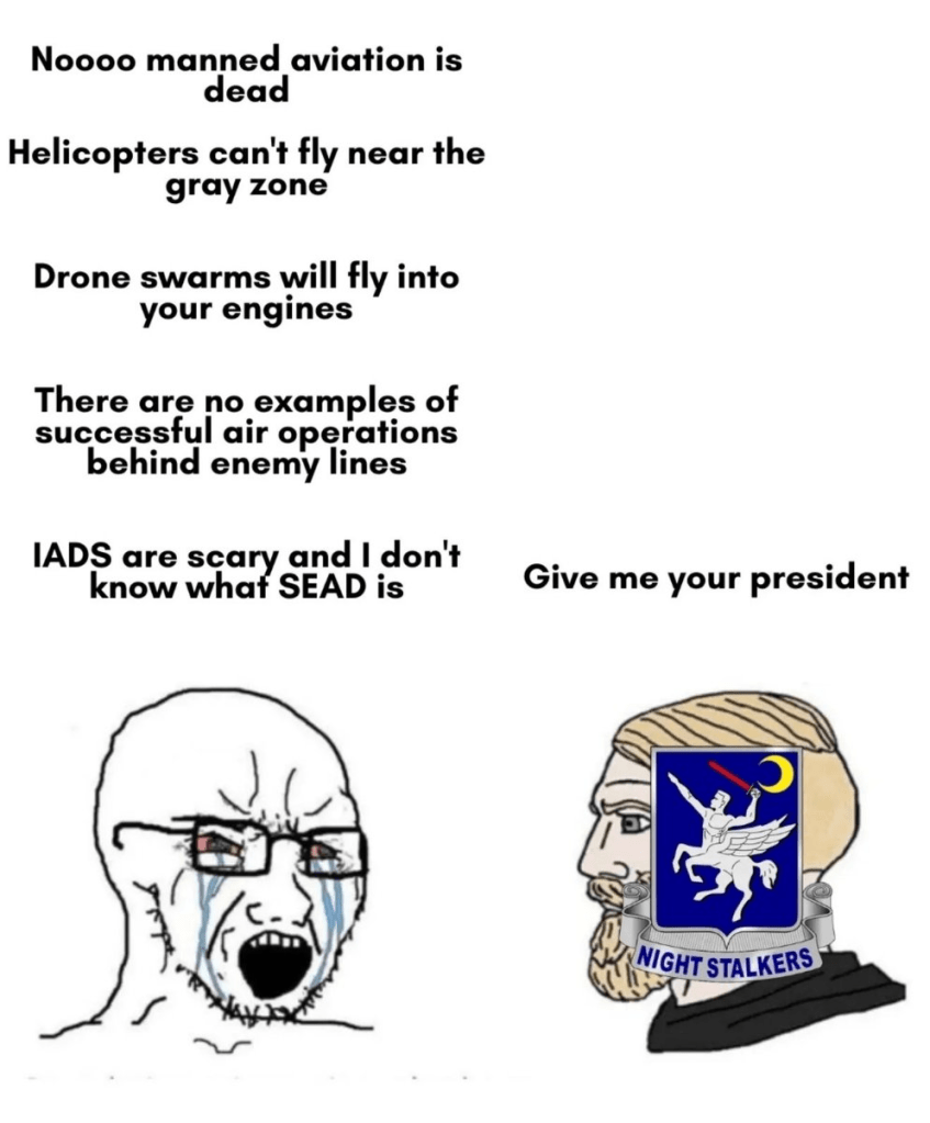 And the CAS mission will be filled by drones, according to The Experts Who Will Not Be The Guys On The Radio Asking For CAS. And the helicopter escort mission won’t matter anymore, because helos are obsolete in the modern battlefield, because little quadcopter electric drones from aliexpress.