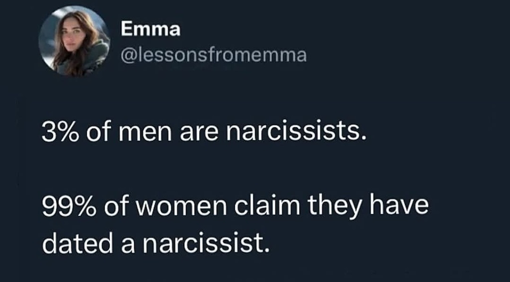 Alternative explanation: 99% of women are entitled, and dismiss men not serving their entitled mentality as being narcissists, because nothing is ever their fault.