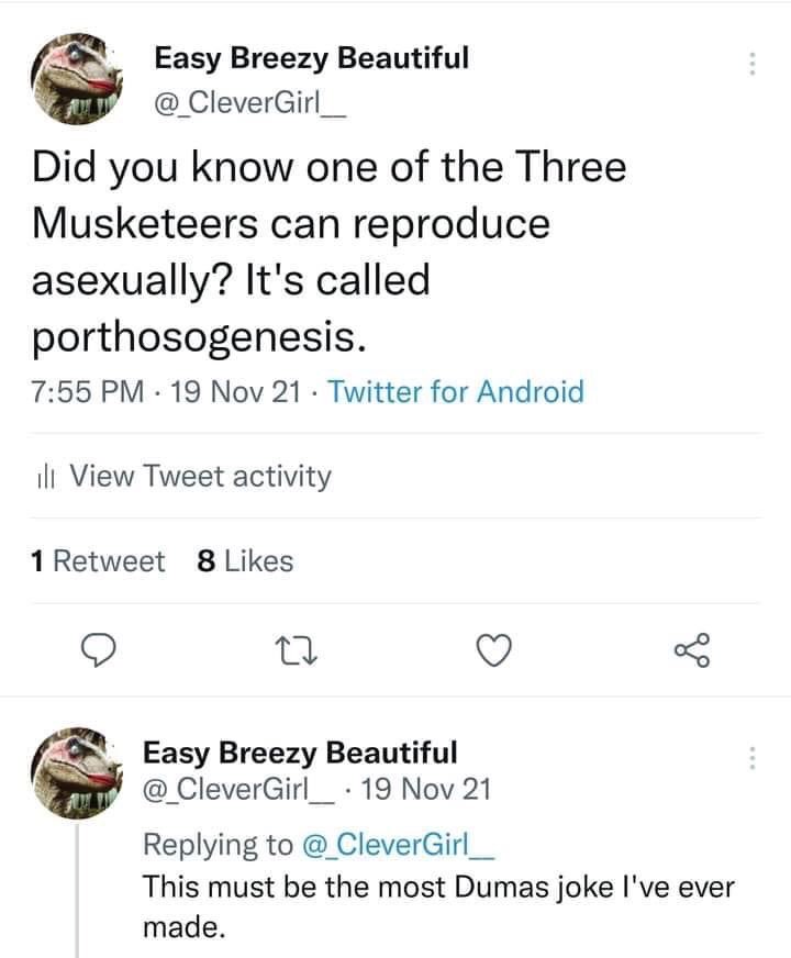 “The pub one fits me, to a ‘Q'” “You me to a ‘T’ don’t you?” “No I drink Quarts, not Tequila” “Wait, what…?” LikeLike Reply