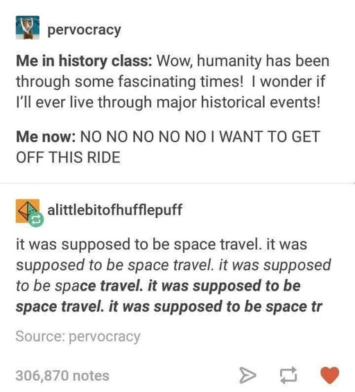A couple of memes about living in eventful times.